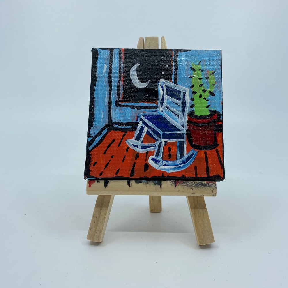 rocking chair and cactus next to window with a waning crescent moon
