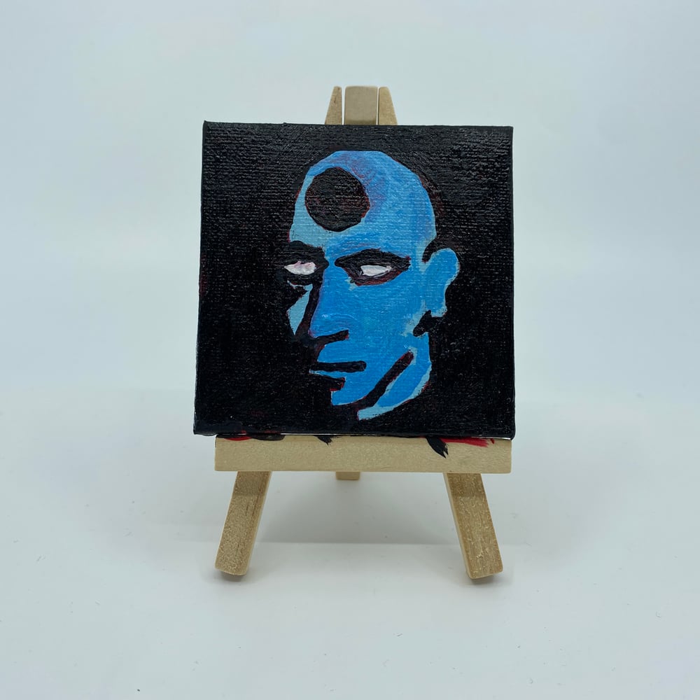 haloed blue being tuning a guitar while sitting on blue chair in a red room with a wooden floor